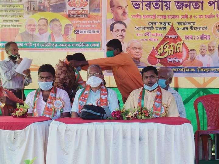 দামোদরদাস নরেন্দ্র মোদির সেবা কার্যক্রমের সূচি অনুযায়ী পূর্ব মেদিনীপুরের কোলাঘাট মন্ডল – ১ এর উদ্যোগে আজ রক্তদান শিবির কর্মসূচি পালন করা হল সিদ্ধা প্রাথমিক বিদ্যালয়ে । সংক্ষিপ্ত বক্তব্যে বলা হয় এই মুহূর্তে রাজ্যজুড়ে রক্তের হাহাকার পড়ে গেছে । নরেন্দ্র মোদির সেবা কার্যক্রম উপলক্ষে আমরা মুমূর্ষু মানুষের কাছে রক্ত তুলে দেওয়ার জন্য প্রত্যেক মন্ডলে রক্তদান শিবির পালন করার সিদ্ধান্ত নিয়েছি । আজকের রক্তদান শিবিরে কয়েকজন মহিলাও রক্ত দান করেন ।